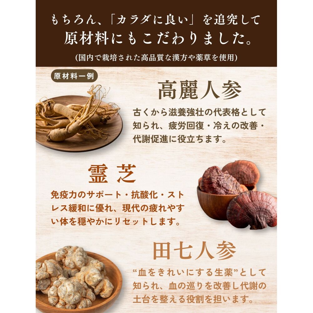 東洋医学で特に評価の高い「高麗人参」「霊芝」「田七人参」をはじめ、普段の食事から摂取しづらい野草類を贅沢に使用しています。