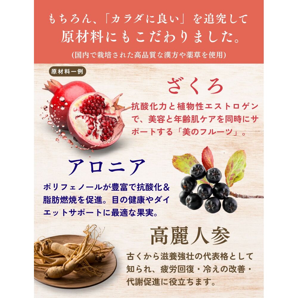 漢方や野草類などの健康補助だけでなく、3大美容成分を配合し、美容補助食品としてお役立ていただけます。